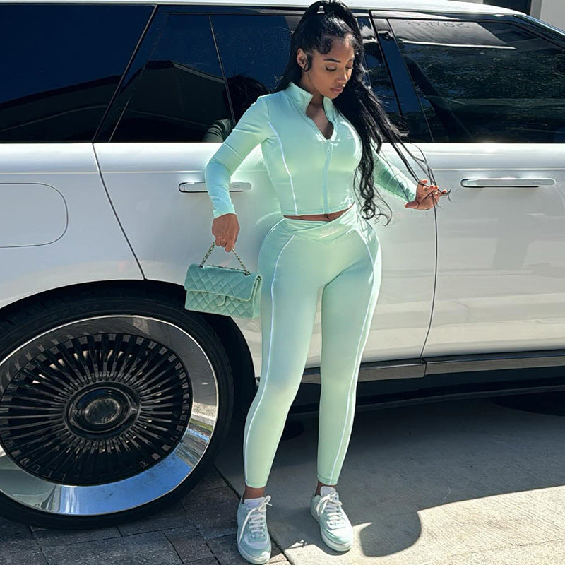 Autumn Winter Women Sexy Cropped Long Sleeve Top Slim Hip Pants Set Women