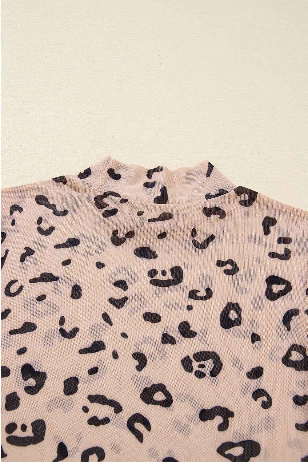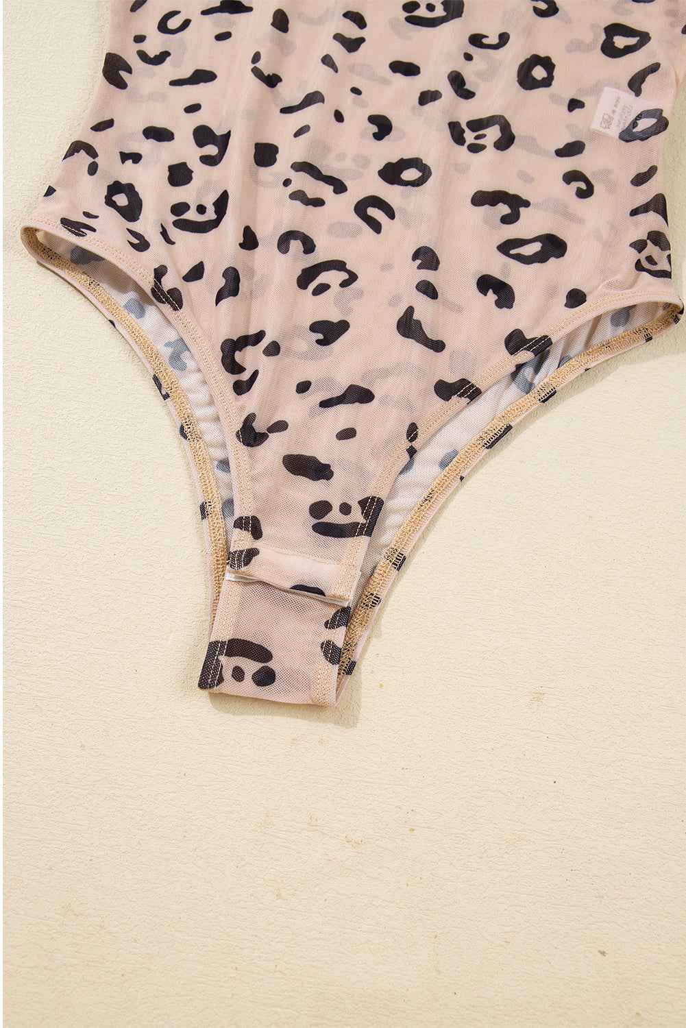 Khaki Mock Neck Sheer Mesh Leopard Long Sleeve Bodysuit
