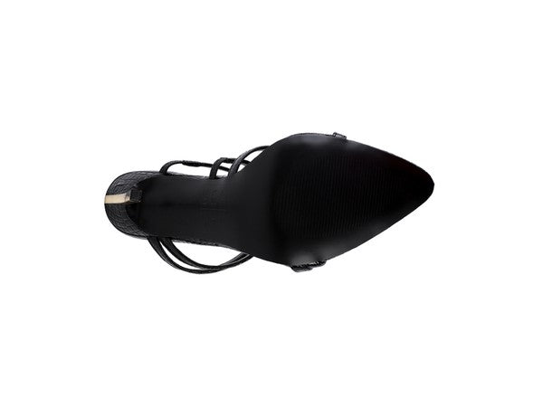 Straight from the haute couture walkways, this pointed shoe in croc textured shiny pu has bling metallic high heel. Comes with light padding which cuts strain. The upper strap has elasticated detail, adding help to all feet sizes.