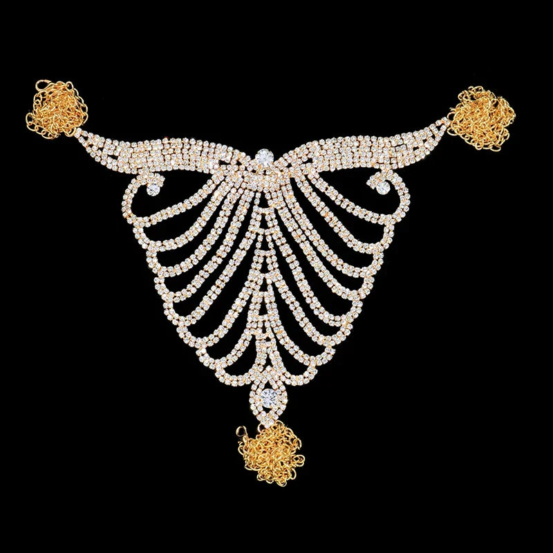 A daring, high-impact body accessory built for the stage, the camera, or any moment that demands full drama. This rhinestone lingerie harness features a sculpted butterfly centerpiece made from shimmering crystal strands, creating an intricate, open-frame silhouette that catches the light with every breath and movement.
