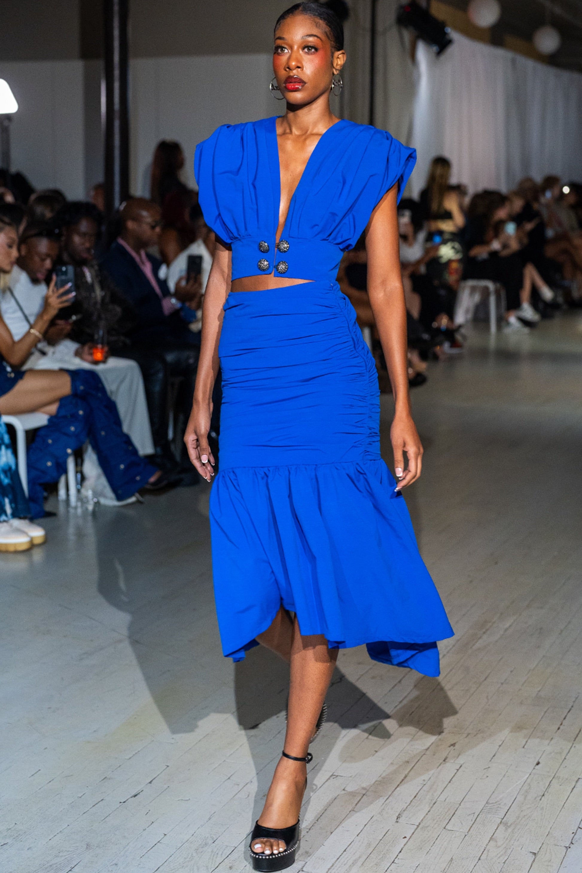 La falda fruncida Rosalie es una prenda impactante diseñada para realzar la textura y el movimiento a cada paso. Confeccionada con meticulosos detalles fruncidos, su silueta de cintura alta esculpe y moldea el cuerpo, mientras que el bajo asimétrico con volantes libera volumen en un acabado orgánico con volantes.