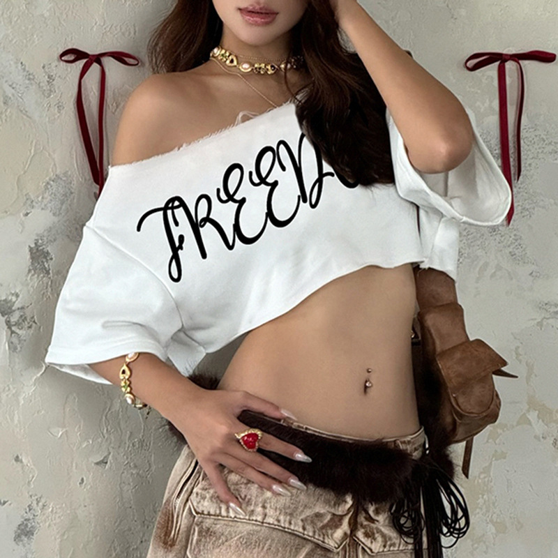 Street Wide Shoulder Letter Graphic Print Short Sleeve Top Sexy Sexy Waist Hollow Out Cutout out Short Loose T shirt Summer