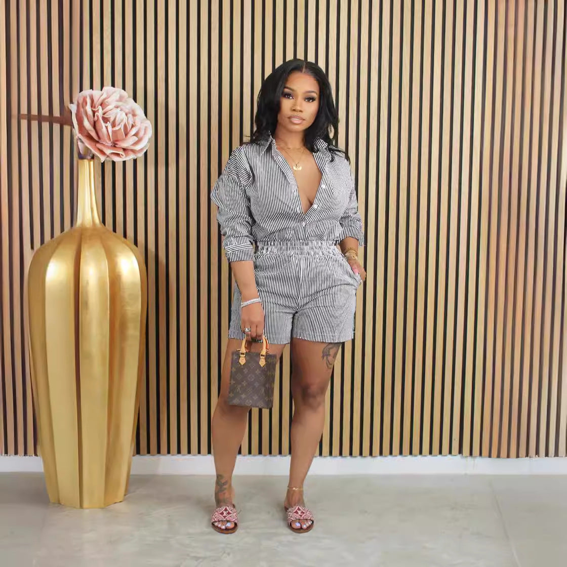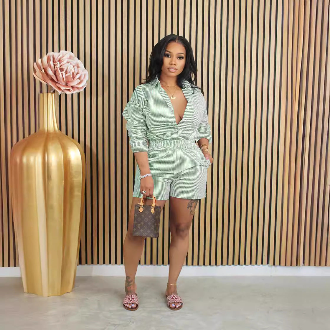 Women Clothing Spring Summer Casual Striped Button Collared Two Piece Set