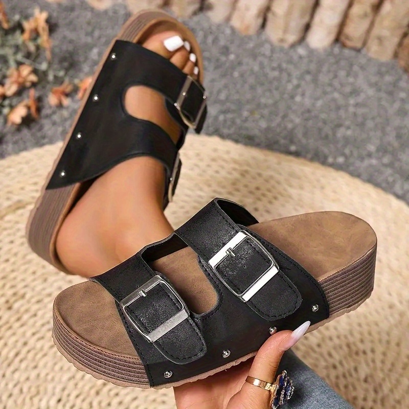 Elegant Summer Flat Sandals, Thick Heel Double Buckle Strap
