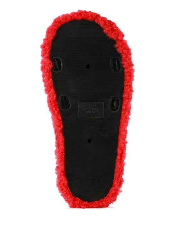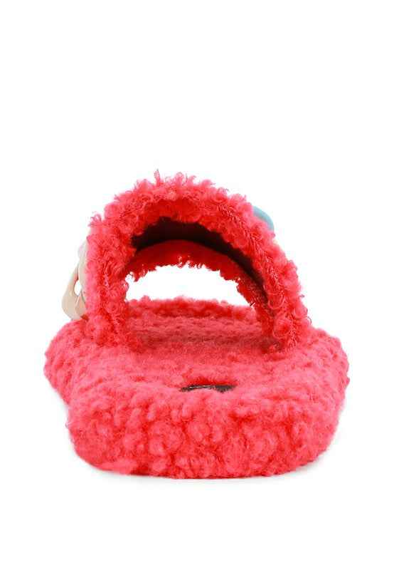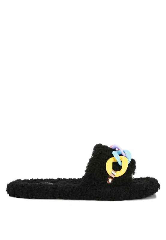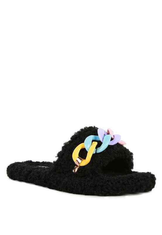 A pair of very fashionable slides with faux fur & acrylic chain on the strap. These slides comes with a very grippy outsole Multiple color's to choose from.