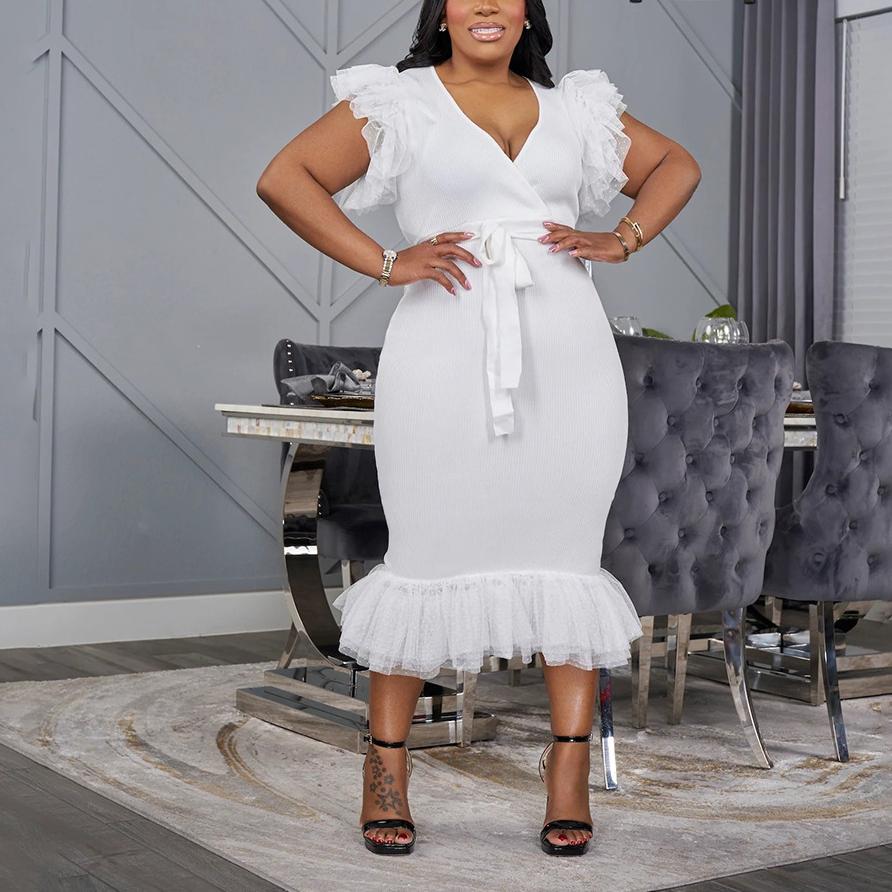 Sexy V neck Solid Color Dress Mesh Pleated Slim Fit Hip Dress