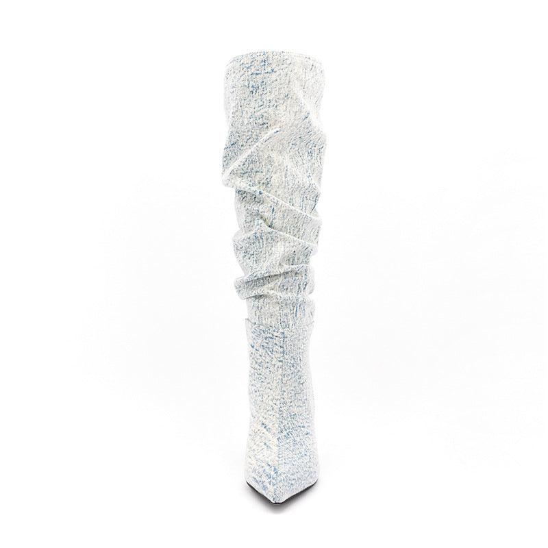 The boots are crafted with premium artificial leather, giving them a unique white denim texture, perfect for adding a chic statement to any outfit.