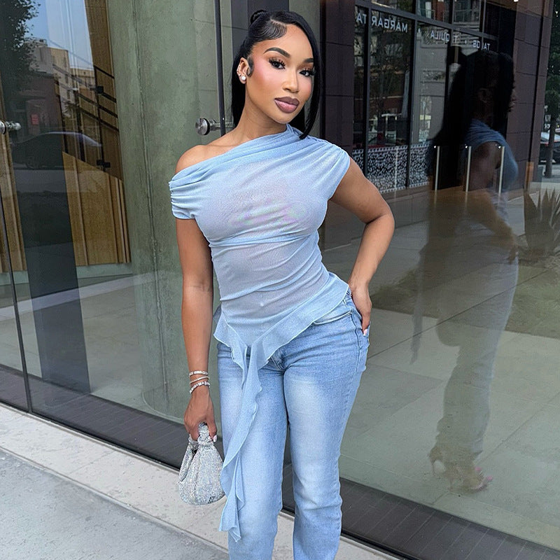 Women Clothing See through Mesh Diagonal Shoulder Short Sleeve Ruffled Ribbon Top