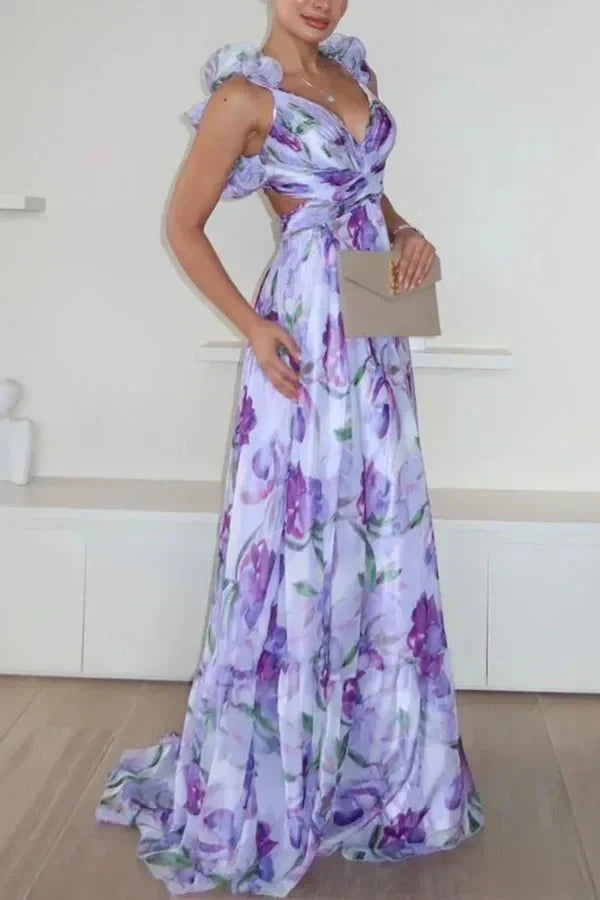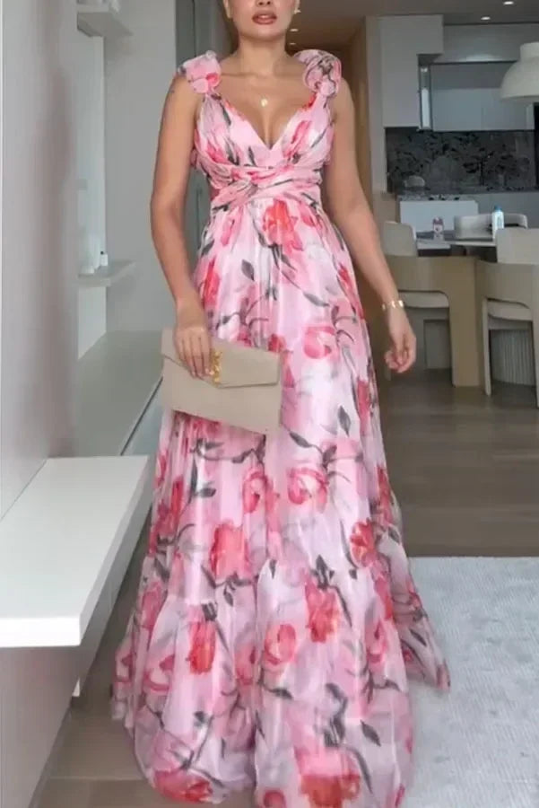 印花雪紡長裙 夏季時尚 優雅V領 荷葉邊