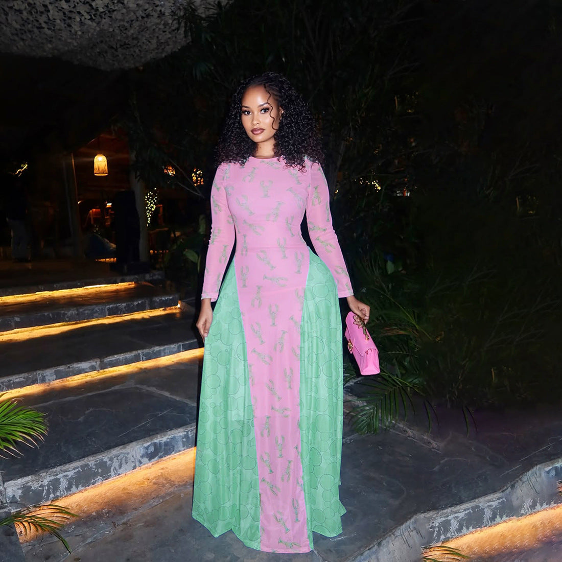 Autumn Retro Women Mesh round Neck Contrast Color Loose Waist Controlled Long Sleeves Printing Dress