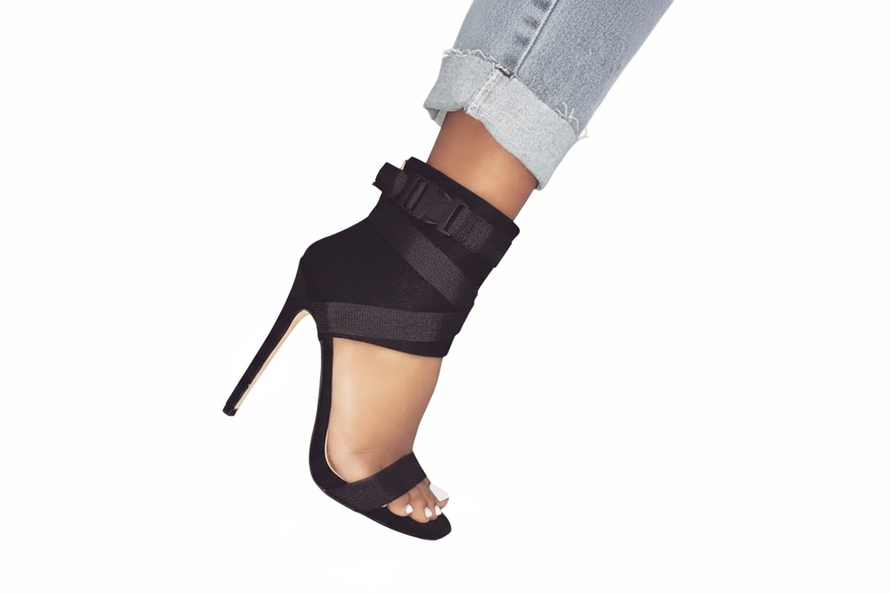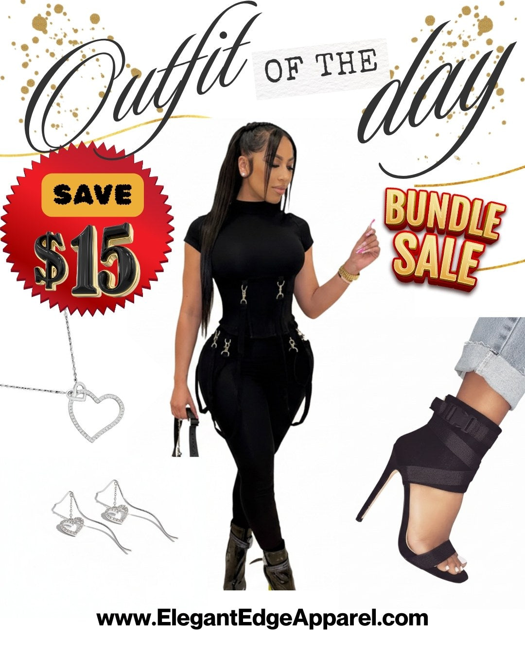 Black strappy two-piece outfit with matching strappy shoes. Including 925 silver tassel earrings and a sterling silver necklace both with heart pendants. This outfit is a statement maker!!