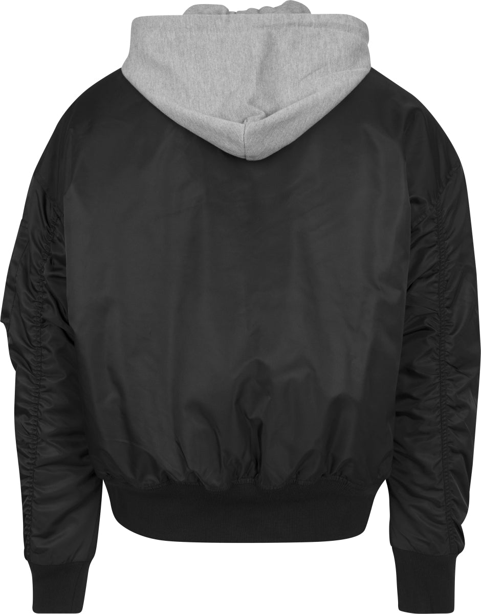When two of the best urban looks come together, the Hooded Oversized Bomber Jacket comes out. The cool bomber jacket combines typical details such as ribbed cuffs, zip pockets and color contrast lining with the casual oversized cut. On top of that a sweat hood with drawstring - the new favorite part is ready.
