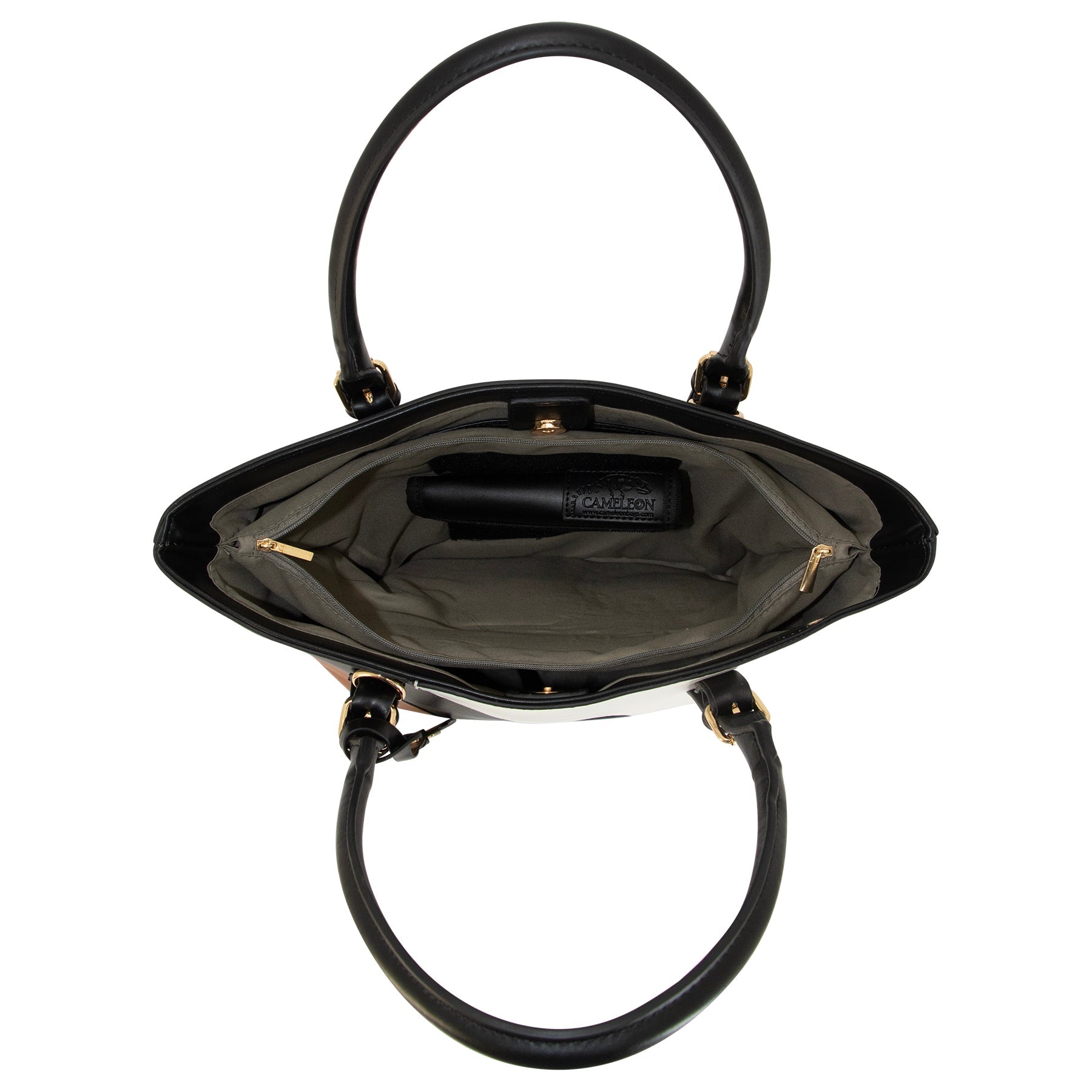 Go straight from the office to dinner with this irresistible top-handle bag, rendered in a sleek black-and-white finish with a small brown highlight touch that turns up the style power of any outsit it is paired with, let this classy piece add structure to flowy silhouettes and be the perfect finishing touch to a monochromatic ensemble.