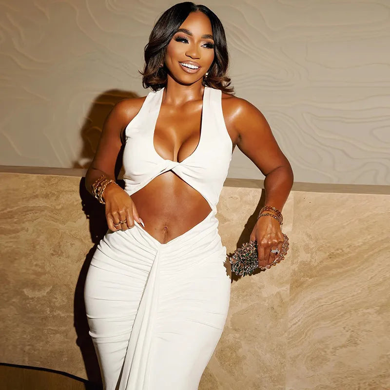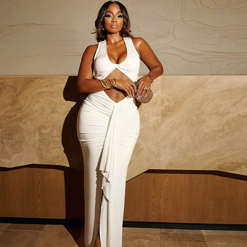 Elegant Pure Color Hollow Out Strap Dress Sexy European Style Street Fashion V-Neck Long Sleeve One Step Skirt With Sash