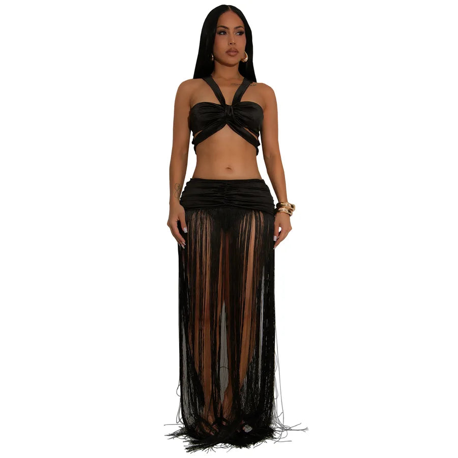 Fashionable Sexy Women's Clothing Set With Shoulder Strap Tassel Long Skirt Two-Piece Suit Style Casual Wear