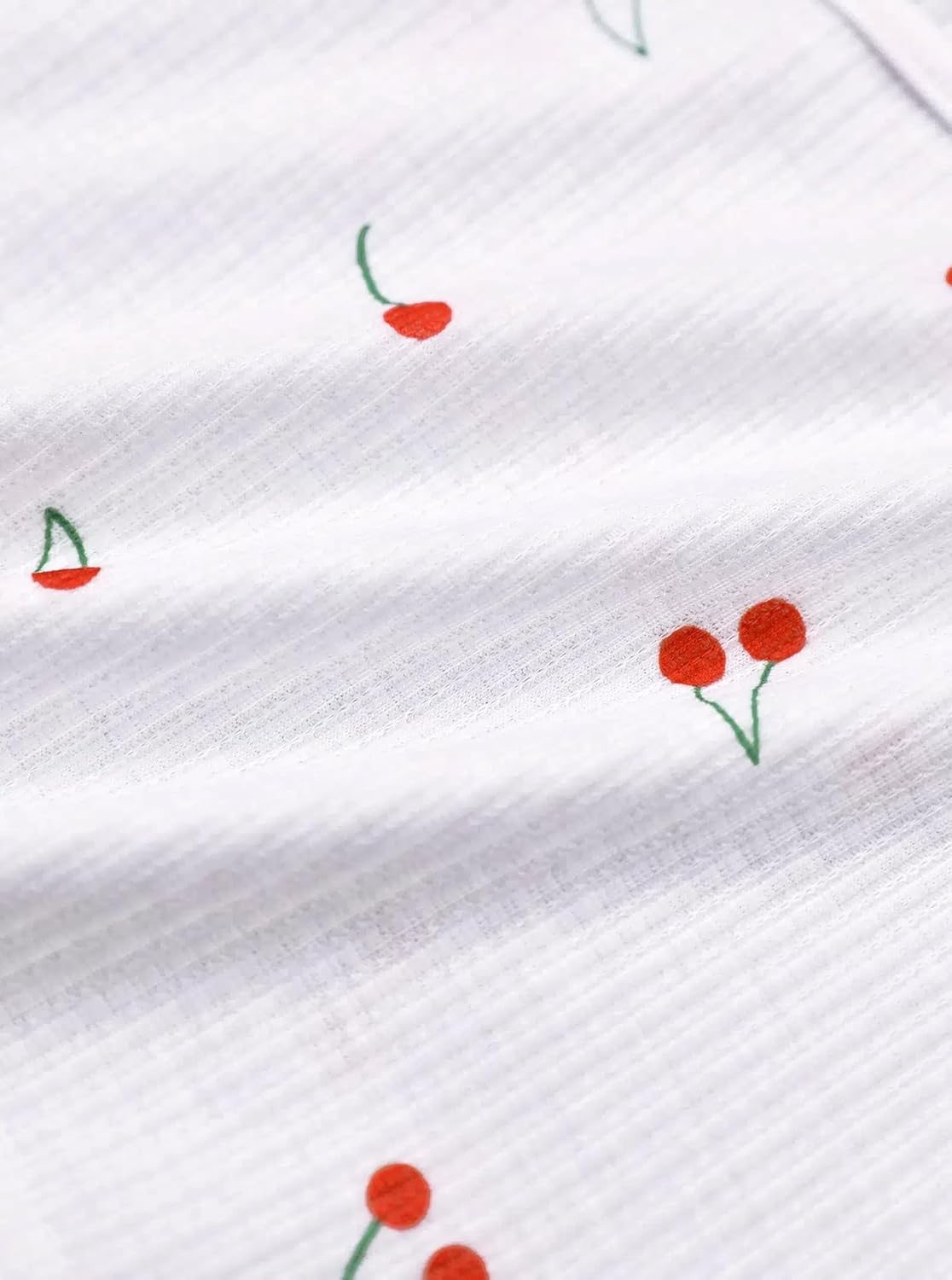 - 設計:這款女士兩件式睡衣採用A字領口、羅紋針織布料、水果圖案、荷葉邊裝飾、撞色飾邊、鬆緊腰帶、短款設計和修身剪裁,非常顯身材。