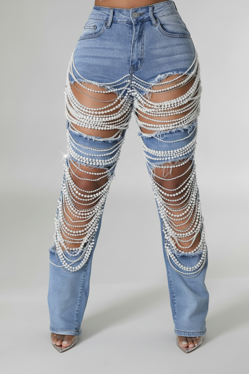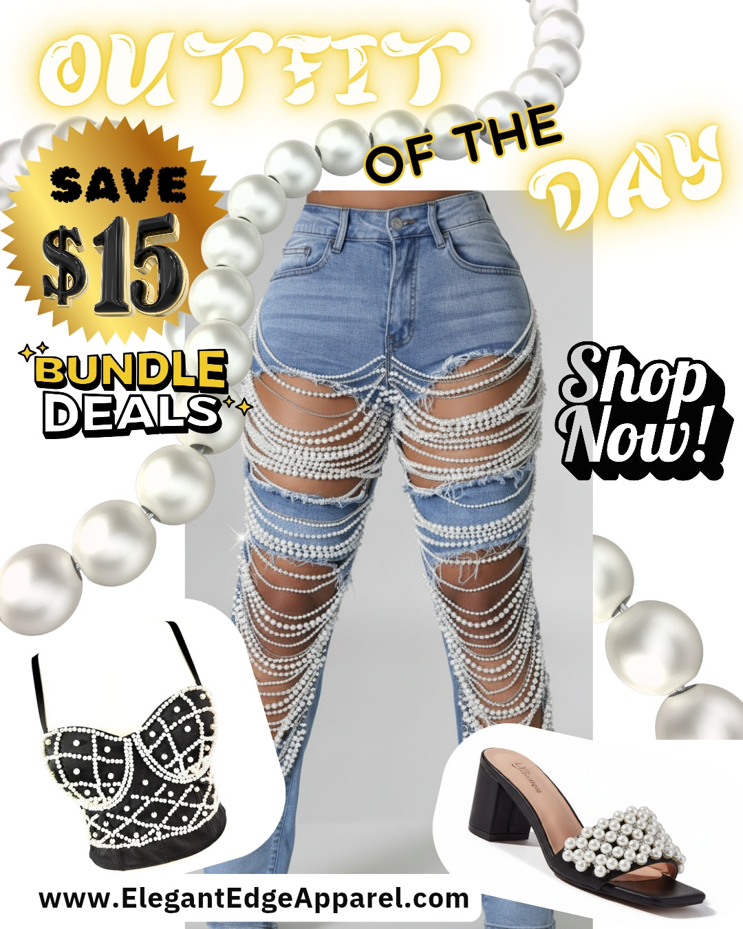 Pearl ripped jeans with a black and pearl crop top. Black pearl slides.