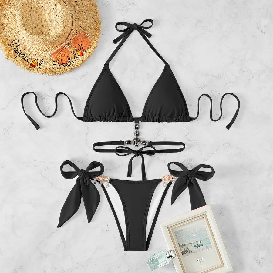 Rhinestone T-Strap Solid Color Bikini
