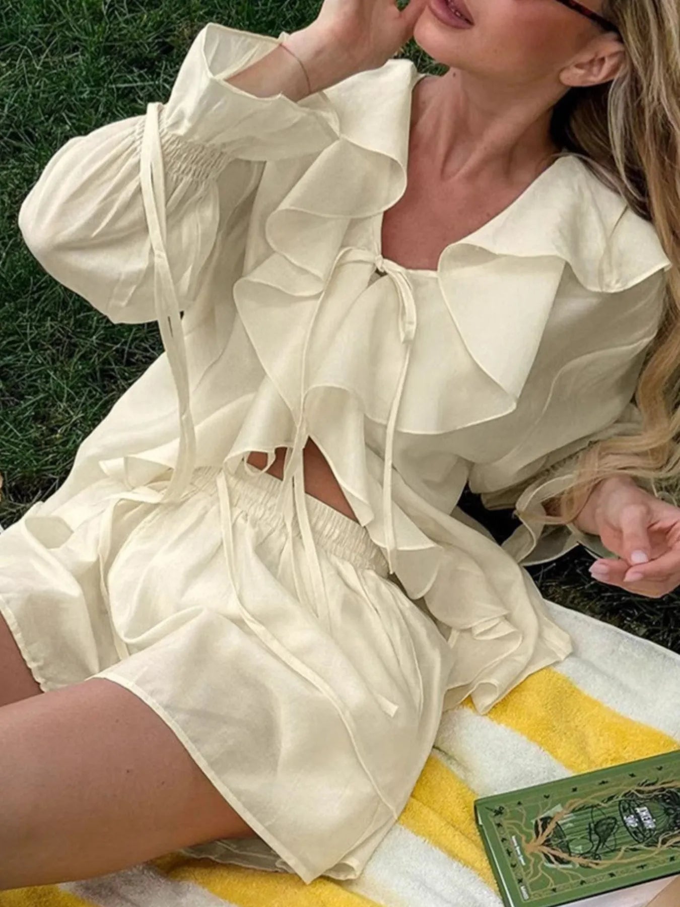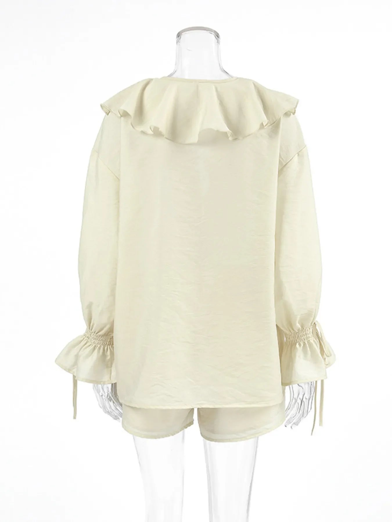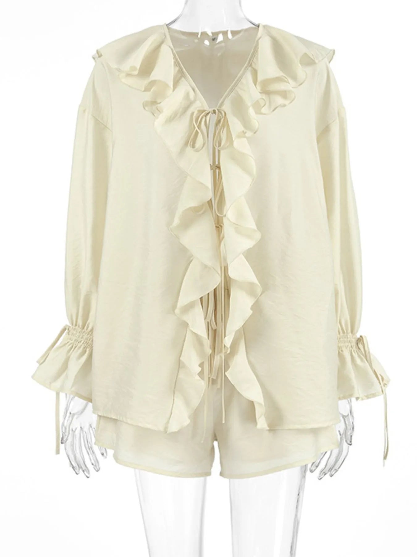 荷葉邊V領上衣和短褲套裝