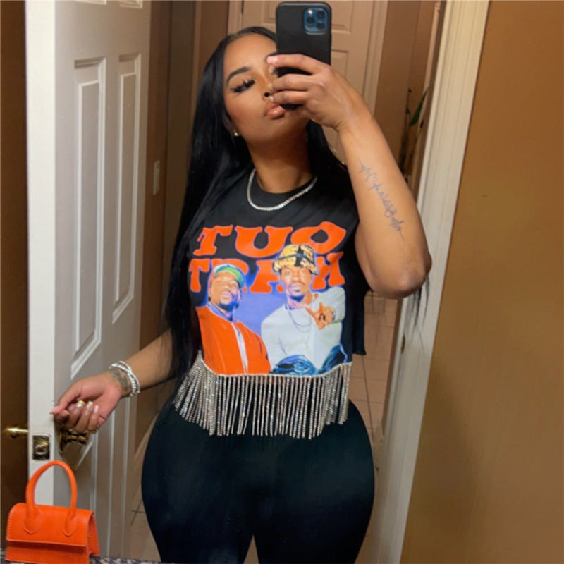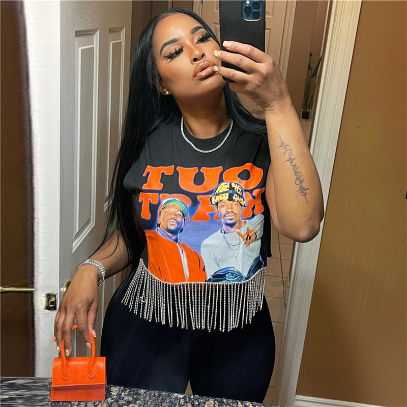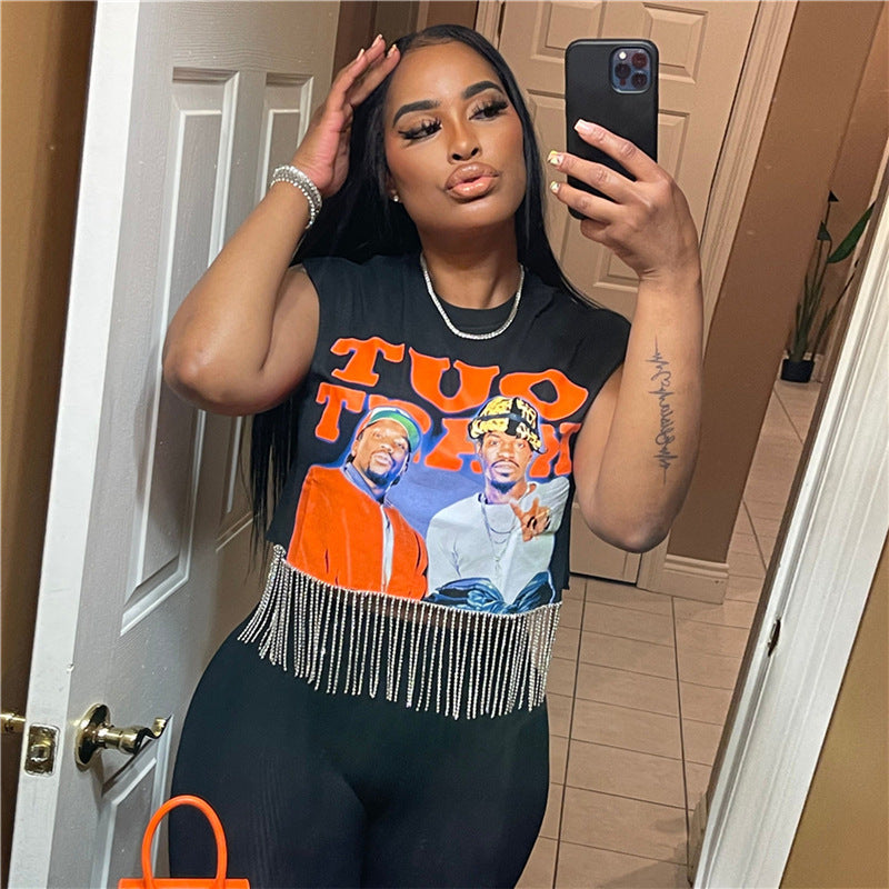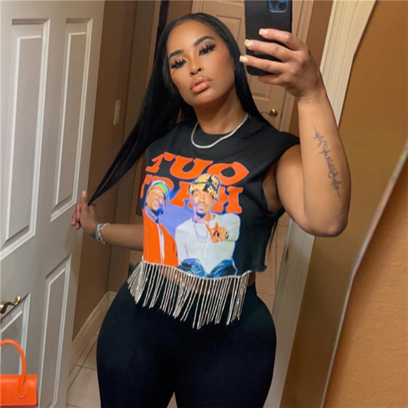 Summer Women round Neck Sleeveless Pendant Hem Slim Printed T-shirt for Women