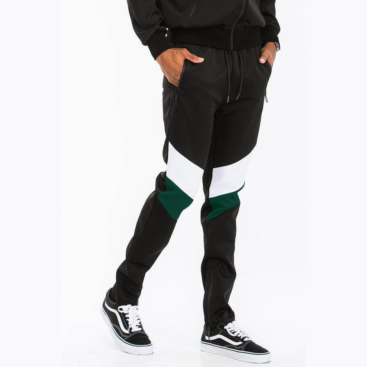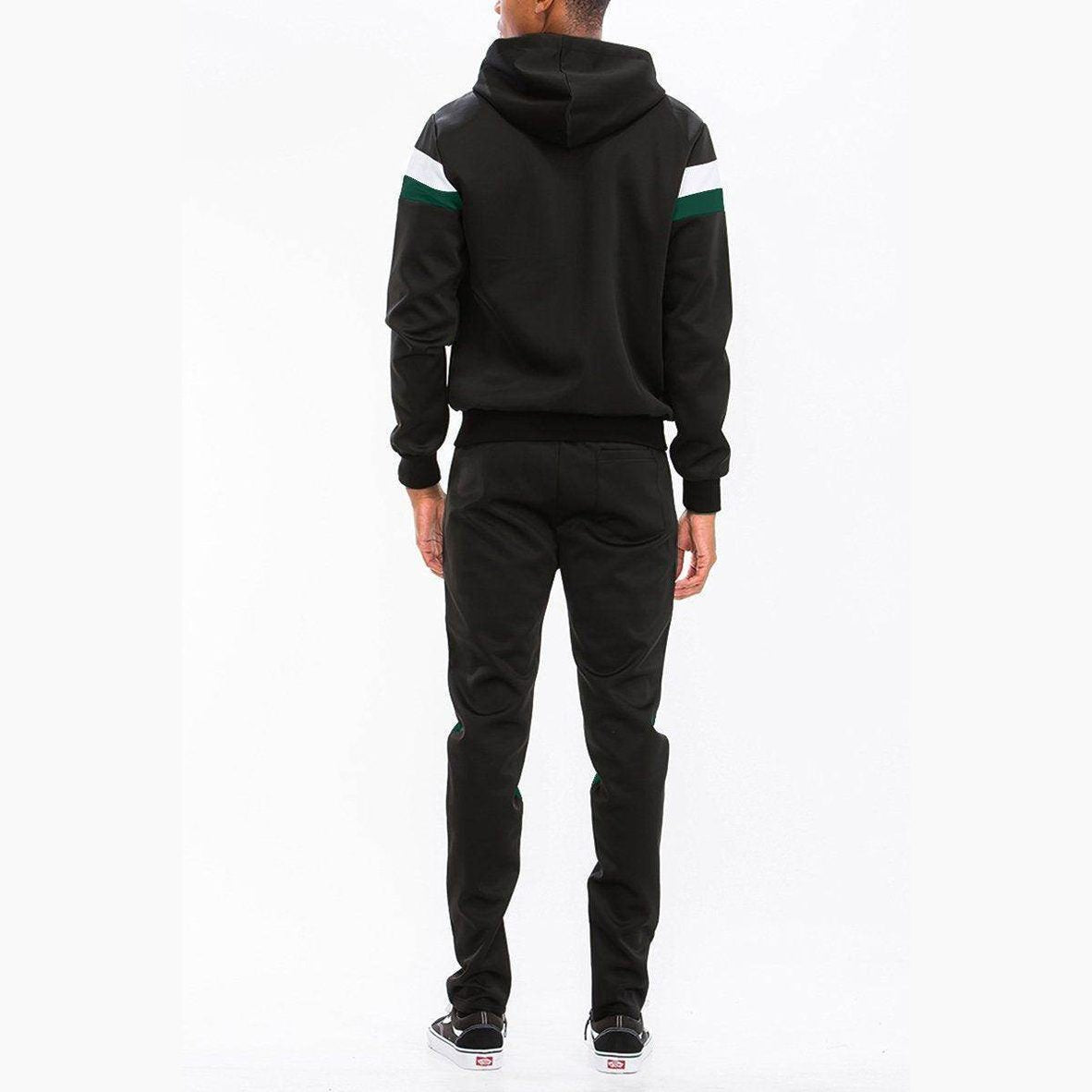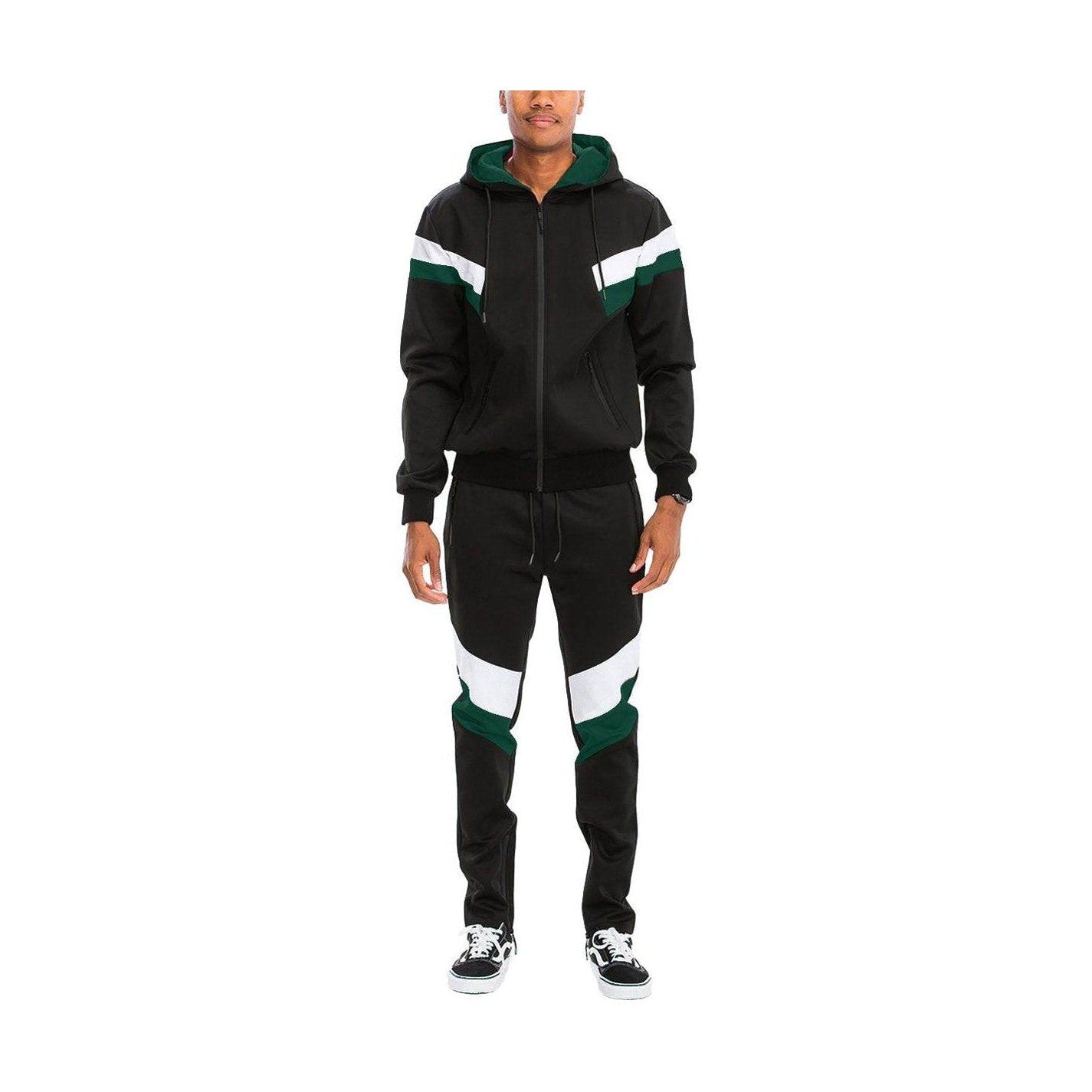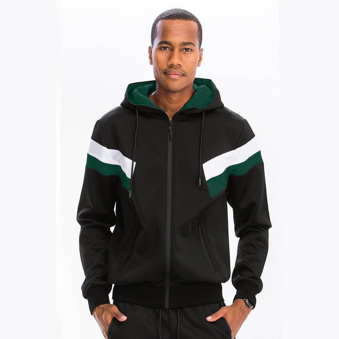 VacationGrabs運動套裝兼具時尚與舒適,是您活力生活方式的理想選擇。這款男士運動套裝適合任何休閒外出或運動場合。時尚的黑綠配色,搭配動感的V型圖案,為您的衣櫥增添現代氣息。