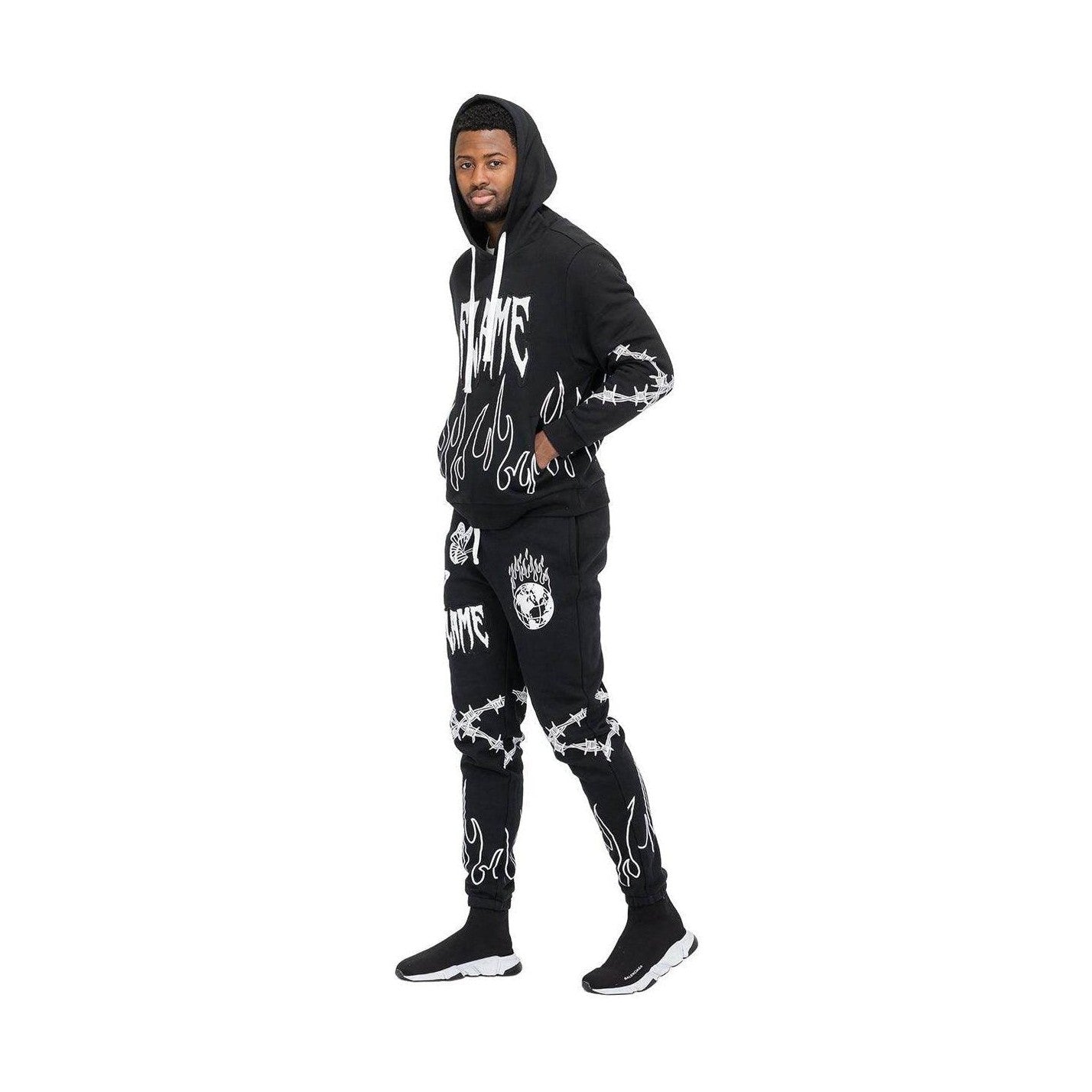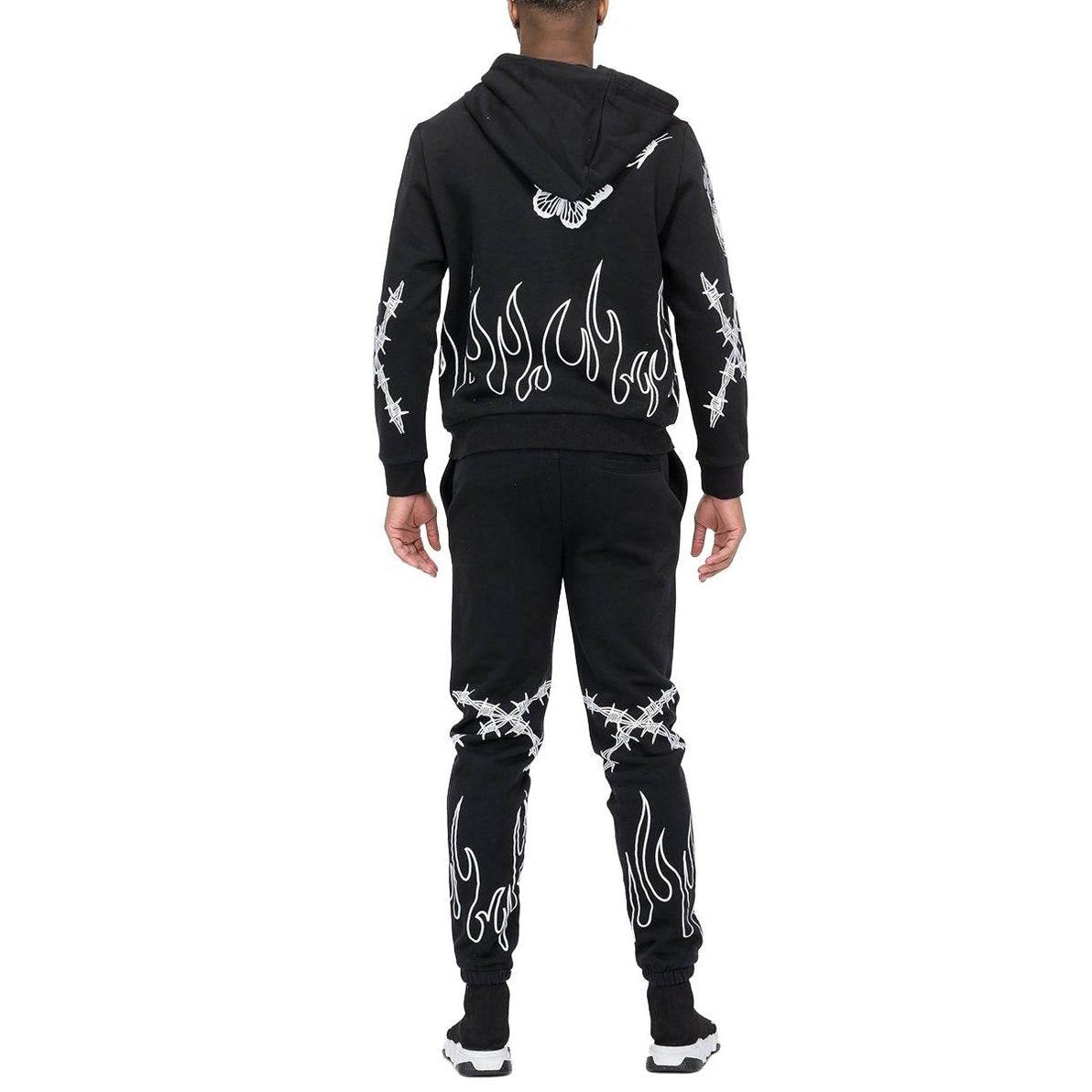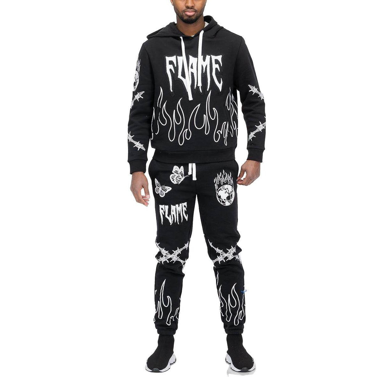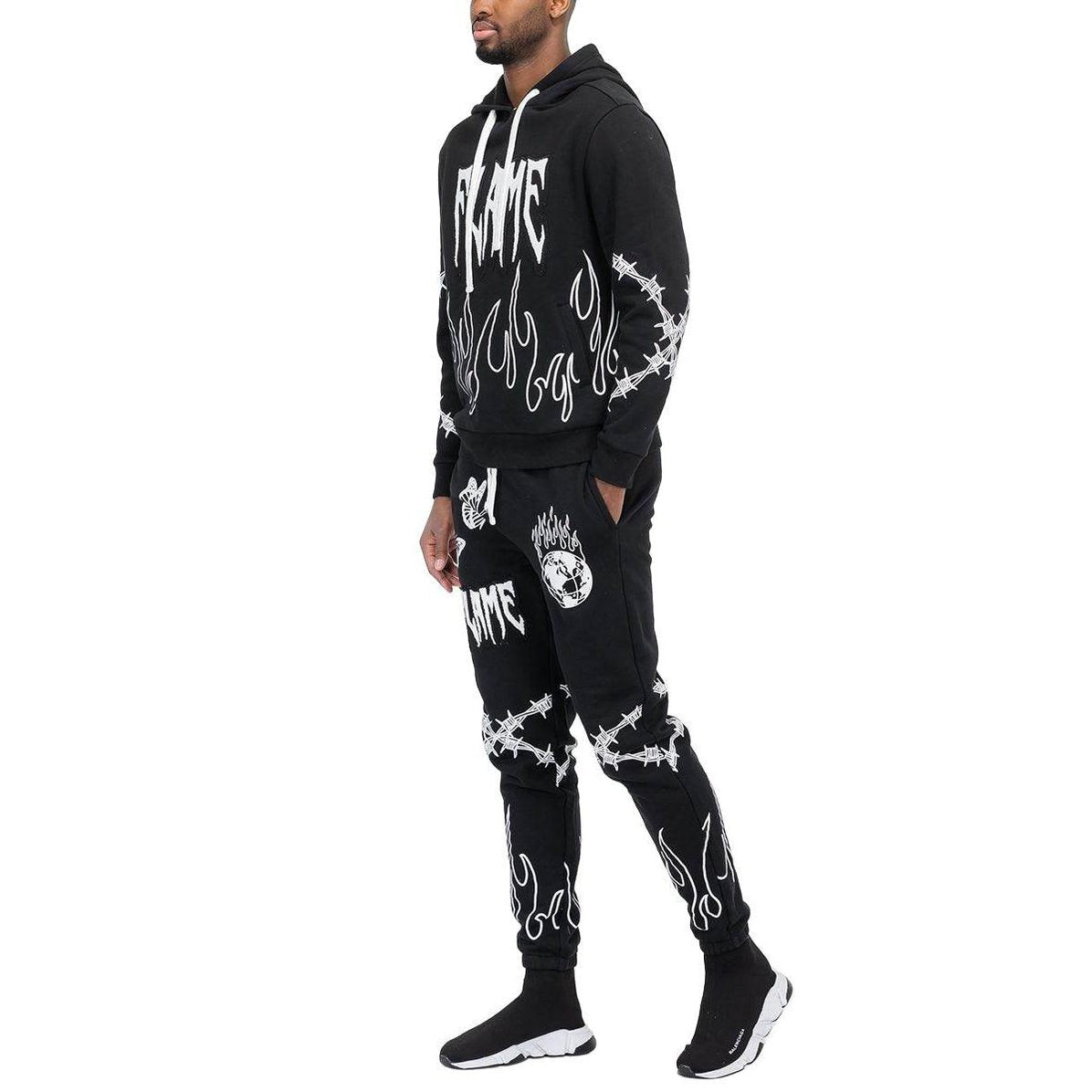 這款套裝用途廣泛,無論是休閒外出或旅行,都能輕鬆駕馭。其引人注目的圖案使其成為任何衣櫥中的獨特選擇。連帽衫上精緻的火焰圖案更添一絲個性魅力。
