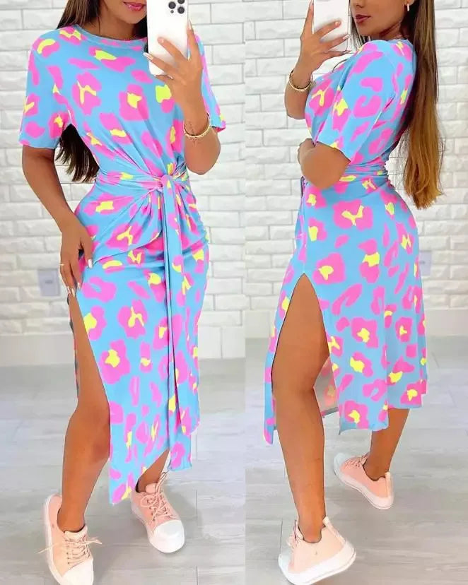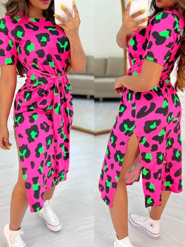 - 白色豹紋連身裙,繫帶開衩設計,側開衩裙,休閒收腰,性感,夏季時尚