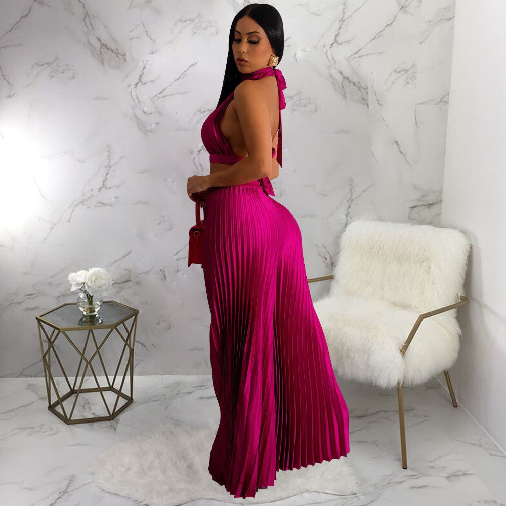 Women Clothing Halter Backless Artificial Silk Pleated Wide Leg Pants Two Piece Set
