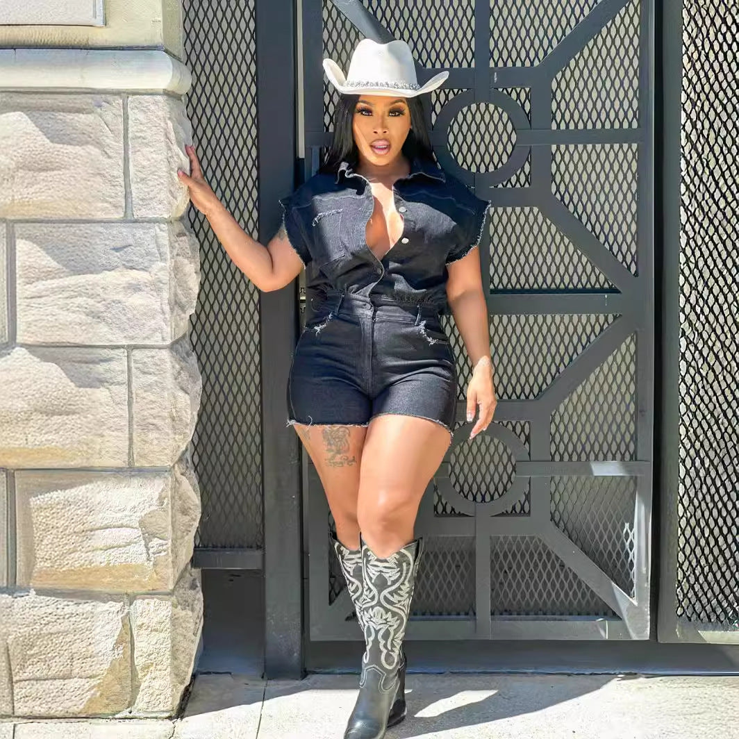 Women Clothing Sexy Short Sleeve Stretch Denim Romper Summer Jumpsuit
