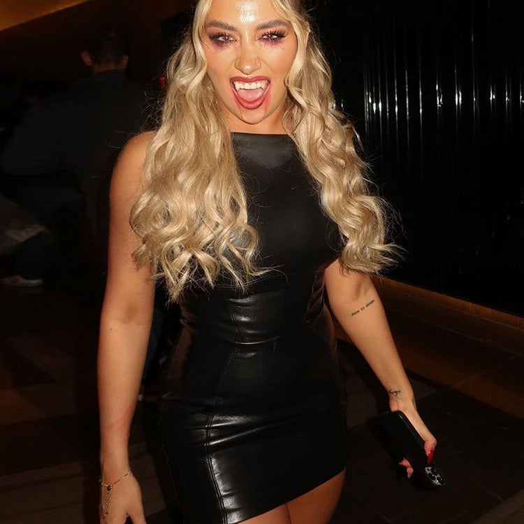 女士春夏仿皮無袖修身顯瘦優雅連身裙